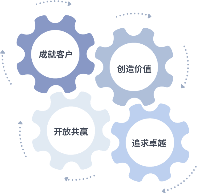 成就客户是一切决策的出发点,创造价值是衡量所有工作的标准,追求卓越是南宫娱乐做事做人的态度,开放共赢是南宫娱乐的格局也是最终的结果。价值观的齿轮环环相扣,推动着组织里的每个人不断向前。